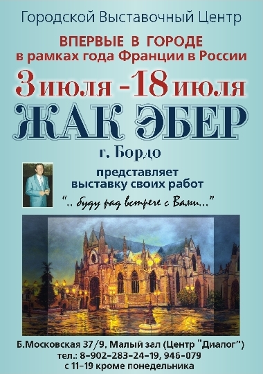 Жак Эбер, художник из города Бордо, что на юго-западе Франции, в Аквитании, давно влюблён в Россию и русскую культуру. Узнав, что 2010 год – год Франции в России, он решил организовать выставку своих работ в Великом Новгороде. По той простой причине, что Бордо – один из самых древних городов Европы. Его история уходит в I век до н. э., когда на левом берегу реки Гаронны обосновались кельтские племена. Со средних веков Бордо известен как центр торговли, навигации и виноделия (знаменитый вином «френч кларет», которое только у Ноздрёва поворачивался язык называть «бурдашкой»), и не случайно покровители города – Меркурий, Нептун и Вакх. Сам Бордо называют портом Луны из-за изящного изгиба Гаронны.