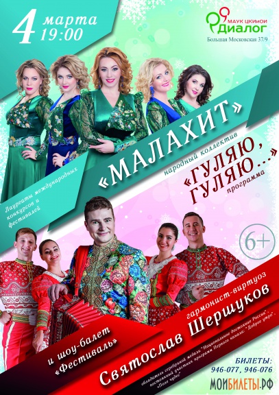 Народно-эстрадная группа «Малахит», гармонист-виртуоз Святослав Шершуков и шоу-балет «Фестиваль» с программой «Гуляю, гуляю...»