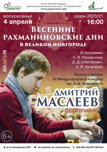 Дмитрий Маслеев – уникальный музыкант, золотой лауреат XVI Международного конкурса им. П.И.Чайковского и многих других, выступавший в самых престижных музыкальных залах мира (Большой зал Московской консерватории, Концертный зал Мариинского театра, Карнеги-холл в Нью-Йорке, Консертгебау в Амстердаме и др.), пианист, которому восторженно аплодировали слушатели России, Европы, Азии и обеих Америк.