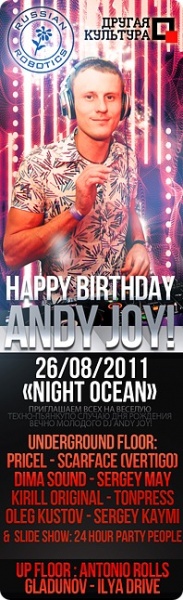 Приглашаем всех на веселую техно-пьянку по случаю дня рождения вечно молодого DJ Andy Joy.