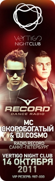 Продолжаем знакомить гостей VERTIGO night club с лучшими артистами Северной столицы! В этот вечер Вас ждут МC СкороБогатый и Dj Cosmo (Record).