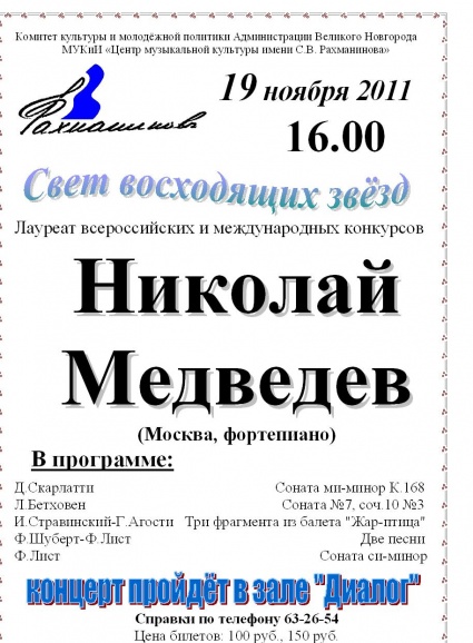 Концерт лауреата всероссийских и международных конкурсов, обладателя молодежной премии «Триумф» Николая Медведева (Москва, фортепиано).
