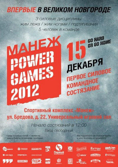 15 декабря 2012 года в спортивном комплексе «Манеж» Великого Новгорода пройдет первое командное силовое состязание «Манеж Power Games 2012».
