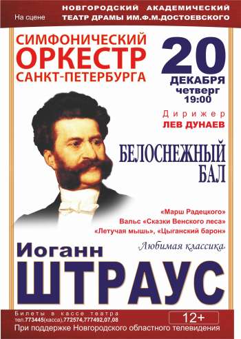 Встречать Новый год и Рождество под музыку Короля вальсов Иоганна Штрауса - давняя европейская традиция. Известный российский дирижер Симфонического оркестра Санкт-Петербурга Лев Дунаев поддерживает эту традицию и 20 декабря 2012 проводит на сцене Новгородского академического театра драмы им.Ф.М.Достоевского Новогодний концерт «Белоснежный Бал Иоганна Штрауса». Для своего выступления маэстро выбрал из наследия австрийского композитора самые знаменитые вальсы.