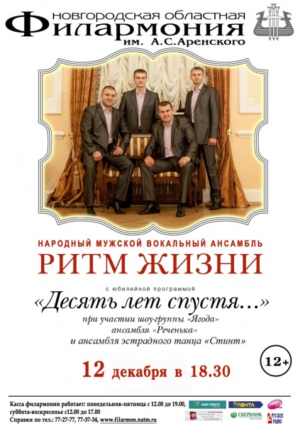 Концерт, посвященный 10-ти летию коллектива - это событие для всех его участников и зрителей! Уже полюбившиеся и новые песни прозвучат в живом мужском исполнении. Гости программы : Шоу-группа "Ягода", вокальный ансамбль "Реченька" и Образцовый коллектив ансамбль эстрадного танца "Стинт".