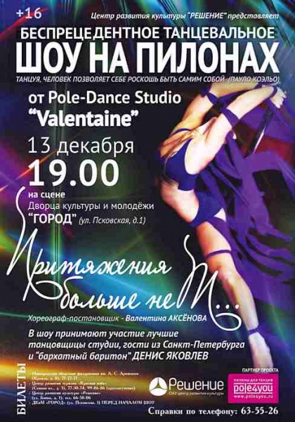 Pole-Dance Studio “Valentine” представляет первое в Великом Новгороде беспрецедентное шоу Валентины Аксёновой. Дерзко. Лирично. Захватывающе. Проникновенно. Танец, который позволяет оторваться от земли и выразить самые сильные чувства в причудливых акробатических образах. Лучшие танцовщицы студии и мастера из Санкт-Петербурга расскажут нежные, страстные, грустные и юмористические истории о мире человека, поборовшего притяжение и наслаждающегося полетом. Сплав музыки, света и умопомрачительной хореографии на пилоне вскружат голову, заставят поверить в невозможное. В шоу принимает участие «бархатный баритон» Великого Новгорода Денис Яковлев.