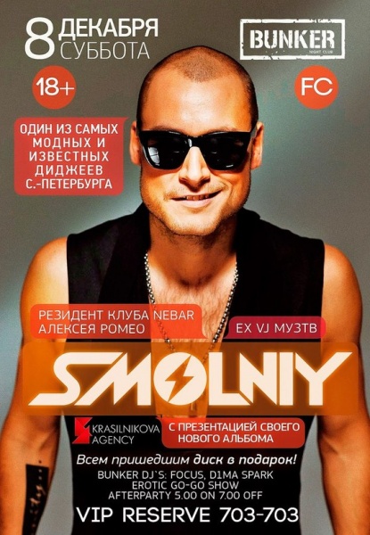 В BUNKER night club заглянет не просто диджей, а резидент клуба Nebar (Алексея Ромео) Василий SMOLNIY. Уж он знает, что такое лучшие тусовки не понаслышке.