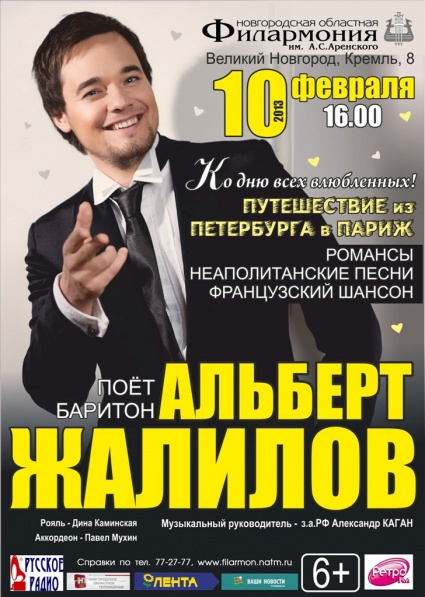 Горожан ждет встреча с замечательным молодым петербургским певцом, лауреатом и обладателей Гран-При многих вокальных конкурсов Альбертом Жалиловым. Это имя уже хорошо известно жителям Великого Новгорода. В преддверии Дня Святого Валентина, Альберт приглашает новгородцев совершить вместе с ним и всеми влюбленными и любимыми, невероятное и увлекательное «Путешествие из Петербурга в Париж».