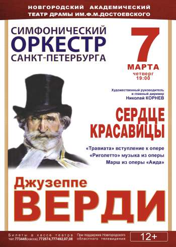 Программа концерта «Сердце красавицы» по-своему уникальна: в нее вошли лучшие фрагменты из опер, созданных Джузеппе ВЕРДИ. На сцене Новгородского академического театра драмы им.Ф.М.Достоевского появятся герои самых популярных опер композитора, - «Травиата», «Риголетто» и «Аида». Наполненные страстью арии прозвучат в исполнении: Ирины Мкртичевой, лауреата Международного конкурса (Виолетта Валери); Анатолия Дичковского, заслуженного артиста России (Жоржа Жермона); Анатолия Ломунова, лауреата Международного конкурса (Альфред); Галины Сидоренко, заслуженной артистки России (Аида).