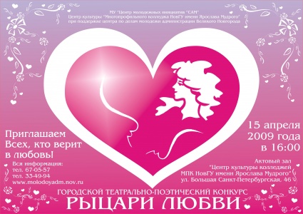 15 апреля 2009 года в 16.00, в актовом зале Центра культуры МПК НовГУ имени Ярослава Мудрого (ул. Б. Санкт-Петербургская, 46) состоится городскоой театрально-поэтический конкурс \"РЫЦАРИ ЛЮБВИ\".