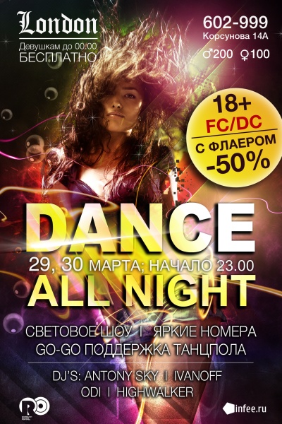 Девушкам до 00:00 вход бесплатно, после 100 руб., молодые люди вход 200 руб.