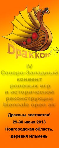 Приглашаем Вас посетить Четвертый Северо-Западный конвент ролевых игр и исторической реконструкции ДраККон-2012-2013 в Великом Новгороде. На этот раз он совместит в себе веселый фестиваль, традиционно "семейный" формат и полномасштабную Академию Игрока: можно будет научиться всему, чему будет желание. И научить.
