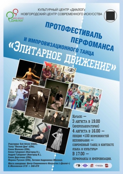 3 августа в 19:00 в Новгородском центре современного искусства (КЦ «Диалог») начинается протофестиваль перформанса и импровизационного танца «Элитарное движение». Он откроется ИМПРОЛАБОРАТОРИЕЙ для всех желающих. 4 августа в 16-00 Ольга Сорокина расскажет много интересного и уникального в своей лекции «100 возможностей непонимания – современный танец в контексте языка и культуры». В 17-00 начало показов.