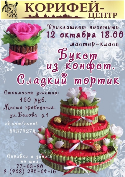 В рамках мастер – класса Вы узнаете о материалах и способах работы с ними, сами сделаете прекрасные розы, а затем создадите небольшой торт в несколько ярусов, ароматно пахнущий шоколадом ;)