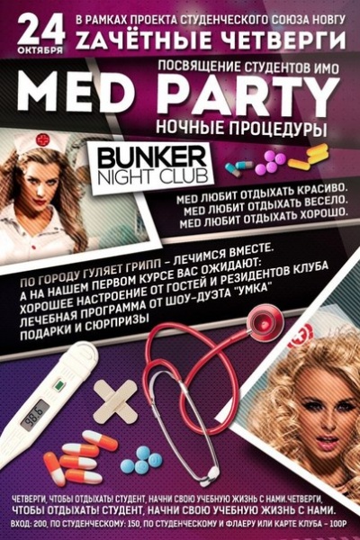 В рамках проекта Студенческого союза Новгу «Zачётные четверги» Посвящение студентов ИМО "MED party. Ночные процедуры".