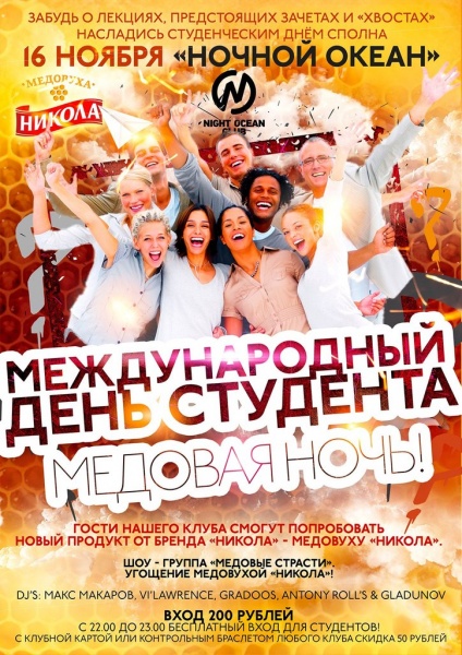 Специальный подарок к Международному дню студента! c 22:00 до 00:00 бесплатный вход для студентов.