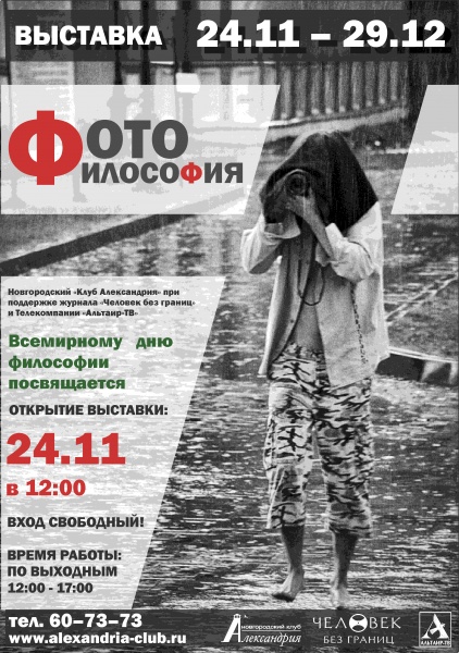 Всемирный день философии отмечается каждый третий четверг ноября. Инициатива проведения Всемирного дня философии принадлежит ЮНЕСКО. Культурный центр «Новгородский клуб «Александрия» ежегодно проводит мероприятия, посвященные этому знаменательному событию. Конкурс и выставка организованы также при поддержке журнала «Человек без границ» и Телекомпании «Альтаир-ТВ»