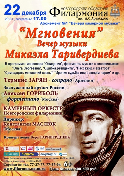 МИКАЭЛ ТАРИВЕРДИЕВ, армянин по происхождению, родился 15 августа 1931 года в Тбилиси. Всю свою профессиональную жизнь, с момента учебы в Государственном музыкально-педагогическом институте имени Гнесиных в классе Арама Хачатуряна и до последней звуковой партитуры, которую он сдал за два месяца до смерти в Московский театр имени Ермоловой, он провел в Москве. Умер 25 июля 1996 года в Сочи, куда уехал на море. Он был спортсменом, фотографом, за год до смерти попал в список секс-символов России, многие годы слыл плей-боем и светским человеком, вел телепрограммы и писал музыку кино. Он композитор необычной судьбы. Его имя было популярным на протяжении всей его жизни в искусстве. Для многих он так и остался автором музыки к кинофильмам «Семнадцать мгновений весны» и «Ирония судьбы». Широко известные работы в кино заслонили огромный пласт творчества Микаэла Таривердиева. Вокальные циклы, сочинения для органа, оперы, балеты, инструментальные концерты – все это оставалось в тени.