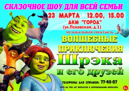 Театр «Любимые сказки» приглашает на свое представление детей в возрасте от 4-х до 14-ти лет, а также их родителей и всех поклонников мультсериала о Шреке. Искрометное музыкальное сказочное шоу никого не оставит равнодушным и подарит море незабываемых впечатлений.