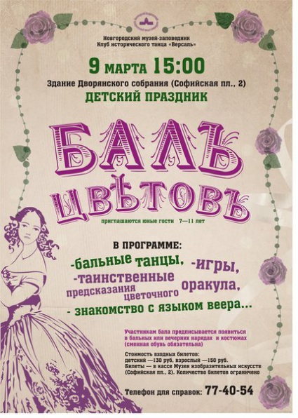 Участникам бала предписывается появиться в бальных или вечерних нарядах и костюмах (сменная обувь – обязательна). Приглашаются дети от 7 до 10 лет.