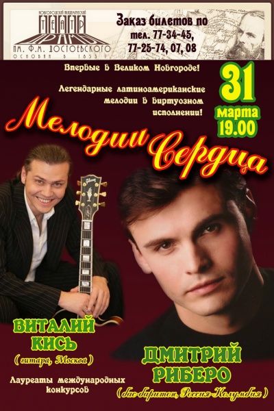 31 марта на сцене театра Драмы впервые в Великом Новгороде в совместной программе "Мелодии сердца" выступят виртуозные исполнители - бас-баритон Дмитрий РИБЕРО (Россия-Колумбия-США) и замечательный московский гитарист ВИТАЛИЙ КИСЬ.