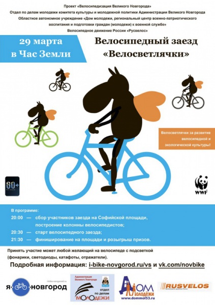 Проект велосипедизации Великого Новгорода «I bike Novgorod» при поддержке велодвижения «Русвелос» в рамках глобальной акции Час Земли, устраиваемой Фондом дикой природы (WWF) проводит велозаезд по Великому Новгороду одновременно с велозаездами во многих городах России под названием «Велосветлячки».