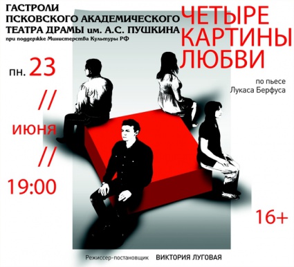 «Четыре картины любви» - это первая постановка одноименной пьесы швейцарца Лукаса Берфуса на российской сцене. Спектакль создан при поддержке Министерства культуры РФ и Гете-института в Санкт-Петербурге. В 2014 году он открывал новый театральный сезон Псковского драматического театра имени А.С. Пушкина.