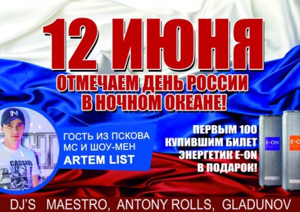 12 июня отмечаем День России в клубе "Ночной океан". Гость из Пскова MC и шоу-мен Артем List. DJ's Maestro, Antony Rolls, Gladunov