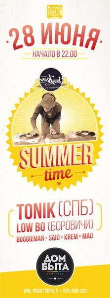 Летнее время - пора жаркой и зажигательной музыки. Летний Хип-Хоп Ивент от Beat Street Flava. Мы подготовили интересных гостей. Приглашаем освежится в знойную пору под ломаные ритмы. Гости: Легендарный DJ TONIK (Cпб), LOW BO Live (Боровичи). Резиденты: BOOGIEMAN, SAID, KREM, MAO.