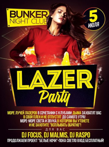 Море лучей лазеров в сочетании с клубами дыма захватят вас в свой плен и не отпустят до самого утра! Море-море света и звука,в котором вы утонете и не захотите "всплывать обратно"!