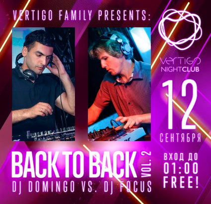 Vertigo Night Club и проект Vertigo Family продолжает серию вечеринок "Back to Back". Четыре пятницы — четыре противостояния известных диджеев Великого Новгорода против резидентов Vertigo Night Club.
