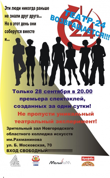 «Театр-24» — это создание и постановка спектакля «с нуля» за одни сутки группой участников, молодых ребят в возрасте от 14 до 30 лет. Участники получают возможность погрузиться в процесс рождения спектакля: от замысла пьесы до её воплощения на сцене. В субботу вечером группа сценаристов соберется вместе, чтобы написать 4 сценария за одну ночь. Каждый раз сценаристам предлагается цитата из художественного произведения, которая, по условиям проекта, обязательно должна прозвучать в каждом из спектаклей. В этот раз цитаты предлагали сами участники.