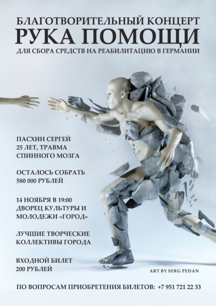 В новгородском дворце культуры и молодежи "Город" 14 ноября пройдет благотворительный концерт "Рука помощи" в поддержку Сергея Пасхина, который сломал позвоночник в Таиланде. Все собранные средства пойдут на реабилитацию новгородца в Германии, необходимо собрать более 500 тысяч рублей.