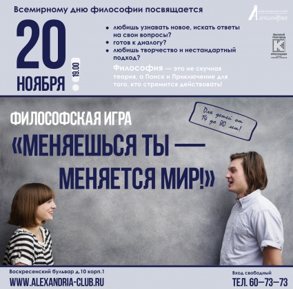 В клубе «Александрия» пройдет философская игра «Меняешься ты – меняется мир!». Мероприятие ко Всемирному дню философии (World Philosophy Day), который отмечается каждый третий четверг ноября с 2002 года по регламенту ЮНЕСКО.