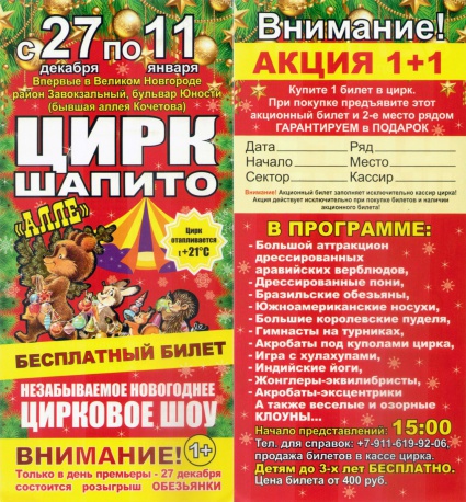 ВНИМАНИЕ! АКЦИЯ 1+1! Чтобы получить второй билет бесплатно распечатайте буклет с нашего сайта и предъявите его в кассе цирка. Второе место рядом гарантируем в подарок!