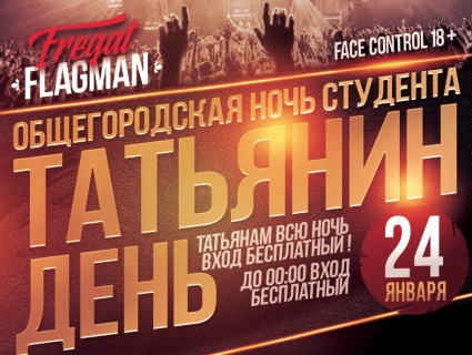 Вход: до 00:00 бесплатный, Татьянам всю ночь вход бесплатный (при предъявлении паспорта).