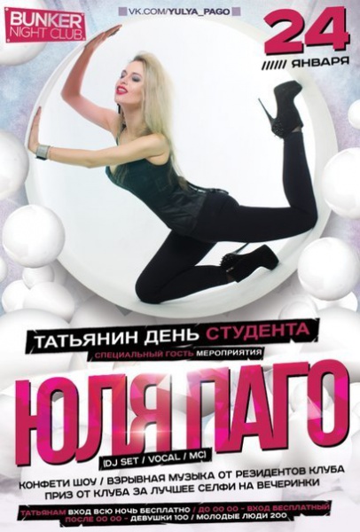 "Татьянин день студента" в BUNKER night club. Специальный гость мероприятия: Юля Паго — одна из самых модных, скандальных и известных героинь клубного движения России, настоящая легенда клубных танцполов и dance-радиостанций. Её треки получают поддержку лучших радиостанций страны.