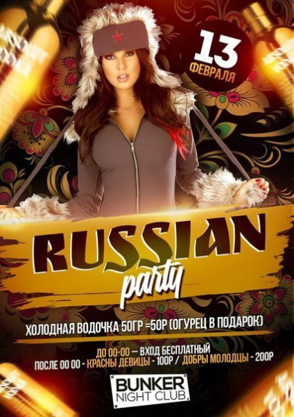 Роскошные русские красавицы и подтянутые добрые молодцы, клубные народные танцы, лучшая танцевальная музыка с просторов РОССИИ и душевные беседы за жизнь в компании медведя!