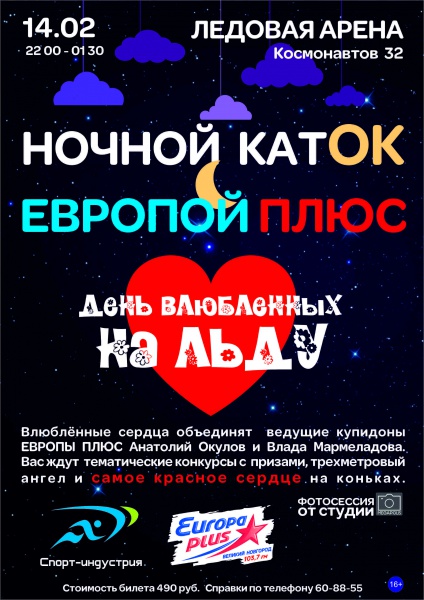 14 февраля на Ледовой арене Великого Новгорода вас ждёт праздничное шоу "Ночной каток с Европой плюс".