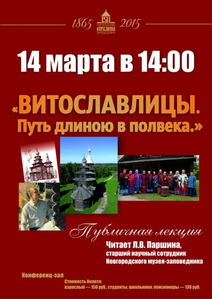В конференц-зале Музея изобразительных искусств пройдет публичная лекция старшего научного сотрудника Новгородского музея-заповедника Людмилы Паршиной «Витославлицы. Путь длиною в полвека». Лекция пройдет в рамках празднования 150-летия Новгородского музея-заповедника.