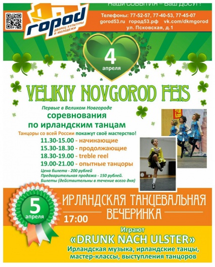 4 апреля пройдут первые в Великом Новгороде открытые соревнования по ирландским танцам. Вы сможете воочию увидеть, как проходят состязания по этому необычному танцевальному направлению, оценить мастерство танцоров всех возрастов со всей России!