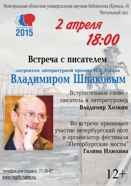 Новгородская областная универсальная научная библиотека приглашает на встречу с известным петербургским писателем Владимиром Шпаковым.
