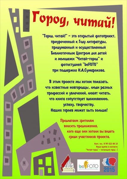 На выставке - известные новгородцы, люди разных профессий и увлечений, но всех их объединит книга. Героев для фотосъемок авторы проекта выбрали не случайно: был проведен опрос среди молодежи Великого Новгорода, кого они хотели бы видеть на снимках. В итоге на фотовыставке новгородцы увидят, например, актеров театра для детей и молодежи «Малый», Н.Варухина, новгородских журналистов, В.Смирнова, Настю Noisy, танцоров, спортсменов и других интересных людей. Проект задумывался и осуществлялся Библиотечным Центром "Читай-город" и фотостудией BeFOTO. А поддержал его известный новгородский меценат Н.Сумароков.