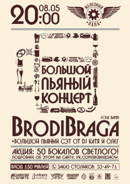 В клубе "Железный папа" пройдет "Большой пьяный концерт" в компании с известнейшей фолк-бандой BRODIBRAGA, которая отыграет большую программу. Завершится этот вечер сетом от резидентов клуба DJ КАТЯ И ОЛЕГ!