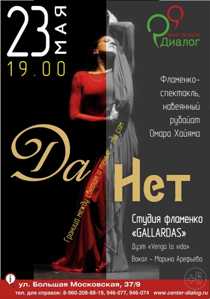 В новгородском культурном центре "Диалог" фламенко-студия "Gallardas" представляет спектакль-размышление, навеянный «Рубайат», собранием стихов известного персидского поэта и философа Омара Хайама. Будет много фламенко... грустного, страдающего, жгучего, разрывающего, веселого, зажигательного...
