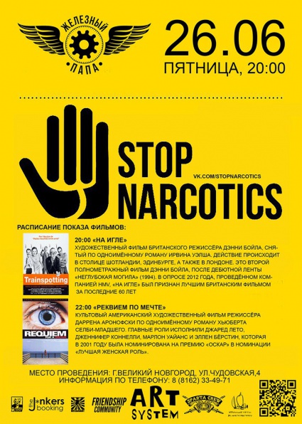 26 июня, в Международный день борьбы с наркоманией, клуб "Железный папа" решил устроить кинопоказ двух легендарных фильмов, которые заставляют задуматься о проблемах наркомании.