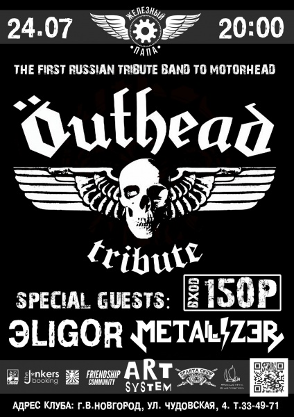 В новгородском клубе "Железный папа" с концертом выступит первый российский трибьют-бэнд группы "MOTORHEAD" — "OUTHEAD" из Санкт-Петербурга.