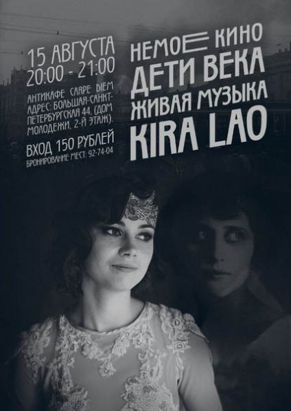 Показ немого кино «Дети века»1915 года с Верой Холодной в главной роли. Современный саундтрек к фильму написала новгородка, солистка группы Kira Lao Кира Зинина. В этом году Кира Зинина принимала участие в проекте «Немое кино+живая музыка». На международном фестивале VOICES в Вологодском кремле она исполнила свою версию музыки к немому фильму «Дети века». В августе Кира решила представить проект в родном городе.