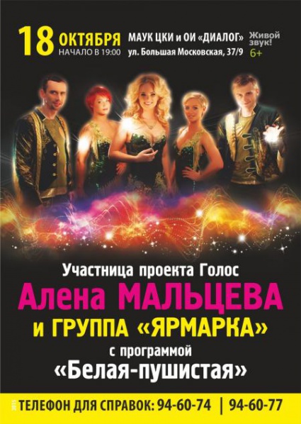 Алёна Мальцева (вокал) - бессменная солистка Фольк-шоу "Ярмарка". Лауреат Международного конкурса "Невские купола". Участница проекта "Голос" на Первом канале. Выпускница Российской Академии Музыки им. Гнесиных.
