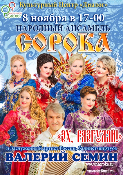 Ансамбль “Сорока” - концертирующий профессиональный вокальный коллектив, продолжающий традиции русского народно-песенного искусства. Лауреат Всероссийских конкурсов и дипломант многочисленных фестивалей в России и за рубежом. В составе ансамбля шесть очаровательных девушек города Великого Новгорода. Особенной популярностью публики пользуются народные песни в исполнении ансамбля в современной музыкальной обработке (стилизация). Название коллектива соответствует колоритному и зажигательному характеру его участниц.